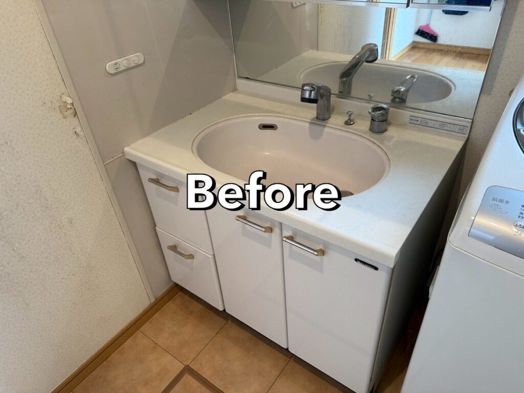 【独立洗面台交換工事の流れ】①既存洗面台の撤去まずは今お使いの洗面台を取り外します。鏡・水栓・排水管・収納部分などを丁寧に解体し、壁や床を傷つけないように撤去します。②配管・下地の調整新しい洗面台のサ